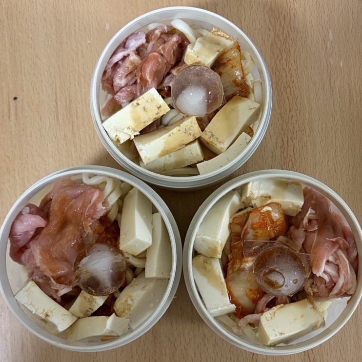 ・豚こま肉 ・キムチ ・豆腐 ・氷1個 - 食べる前に500Wで6分レンチン